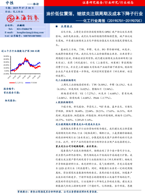 【上海证券】【20190708】20190708-上海证券-化工行业周报:油价低位震荡,继续关注弱周期及成本下降子行业-17页