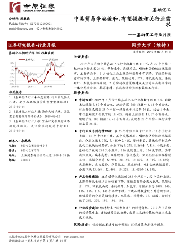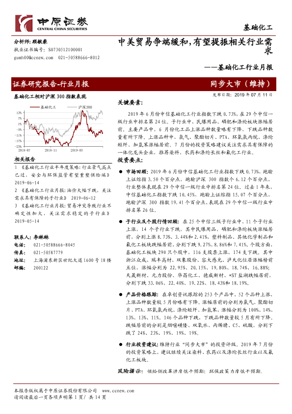 【中原证券】【20190711】基础化工行业月报:中美贸易争端缓和,有望提振相关行业需求-14页