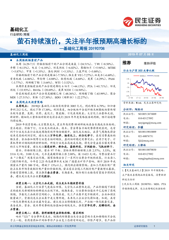 【民生证券】【20190708】基础化工周报:萤石持续涨价,关注半年报预期高增长标的-31页
