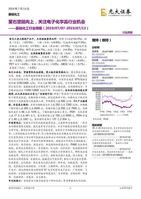 【光大证券】【20190713】基础化工行业周报:萤石坚挺向上,关注电子化学品行业机会-19页