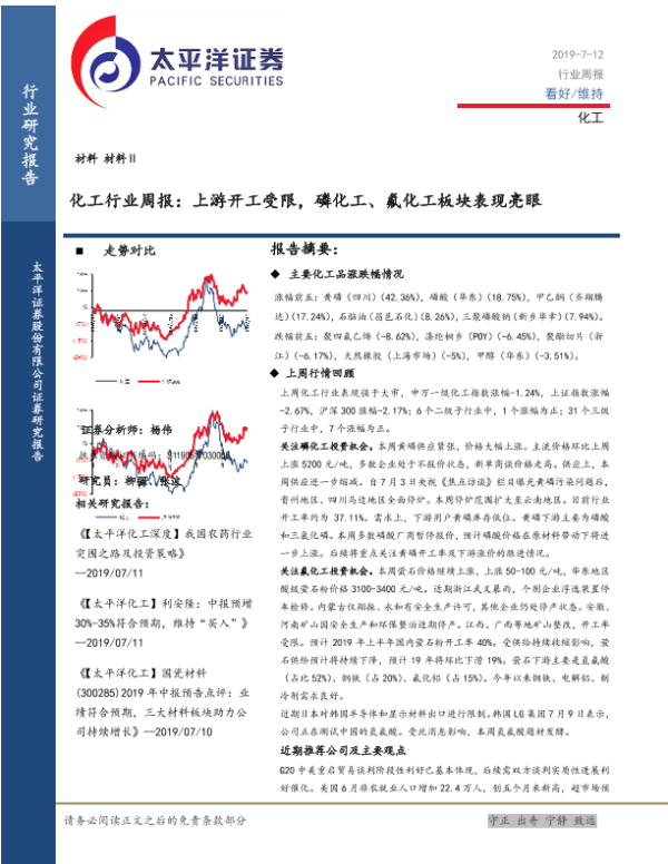 【太平洋证券】【20190712】20190712-太平洋-化工行业周报:上游开工受限,磷化工、氟化工板块表现亮眼-37页