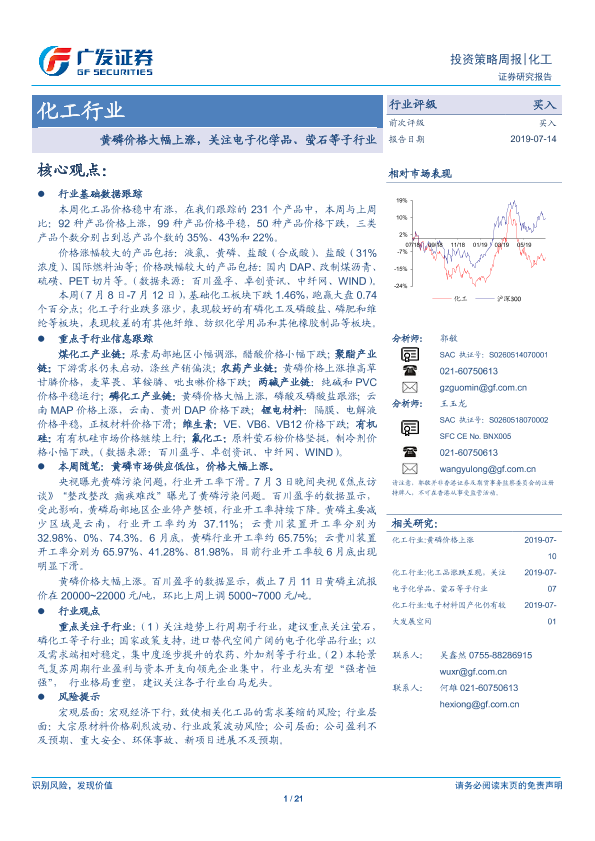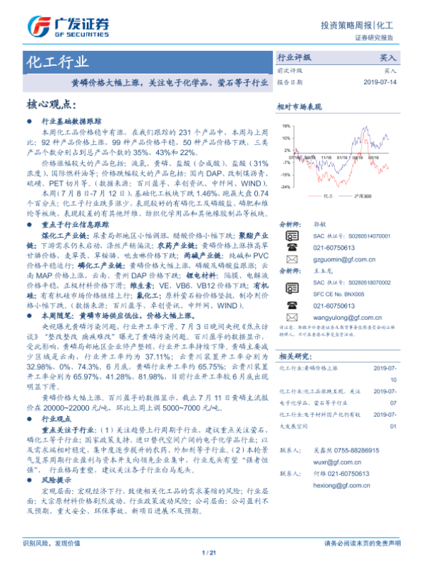 【广发证券】【20190714】20190714-广发证券-化工行业投资策略周报:黄磷价格大幅上涨,关注电子化学品、萤石等子行业-21页