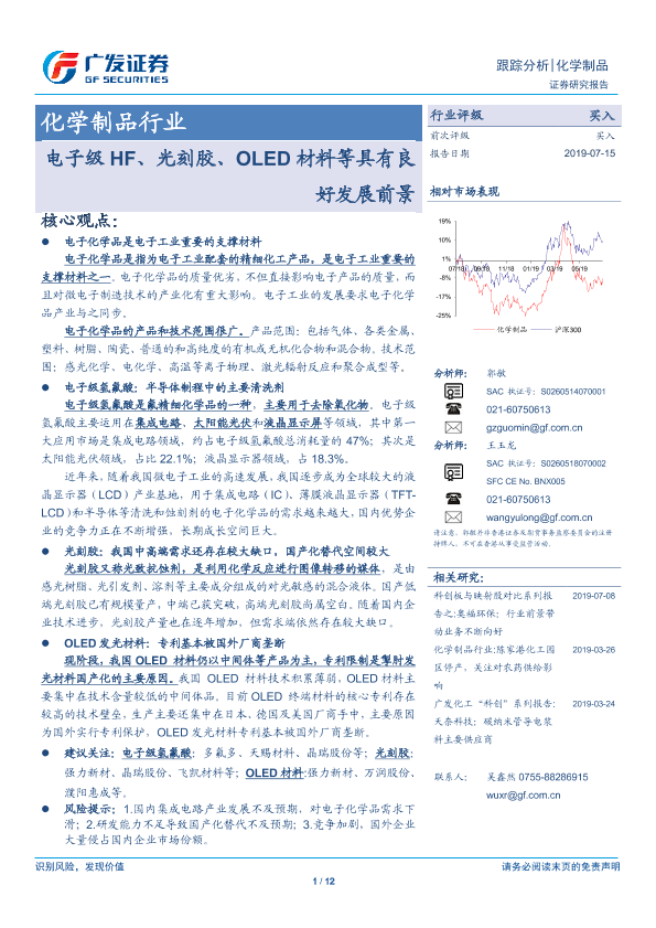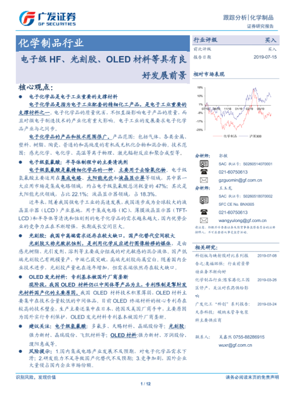 【广发证券】【20190715】化学制品行业:电子级HF、光刻胶、OLED材料等具有良好发展前景-12页