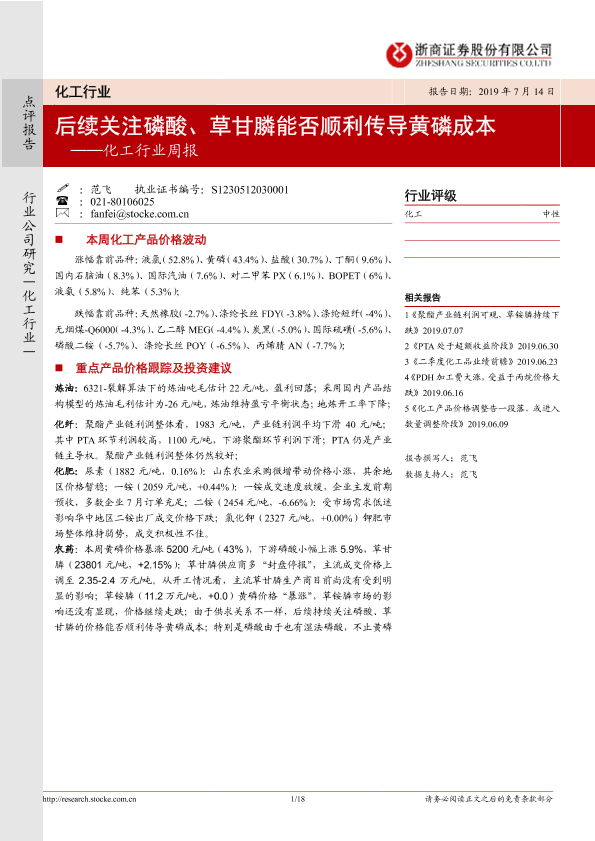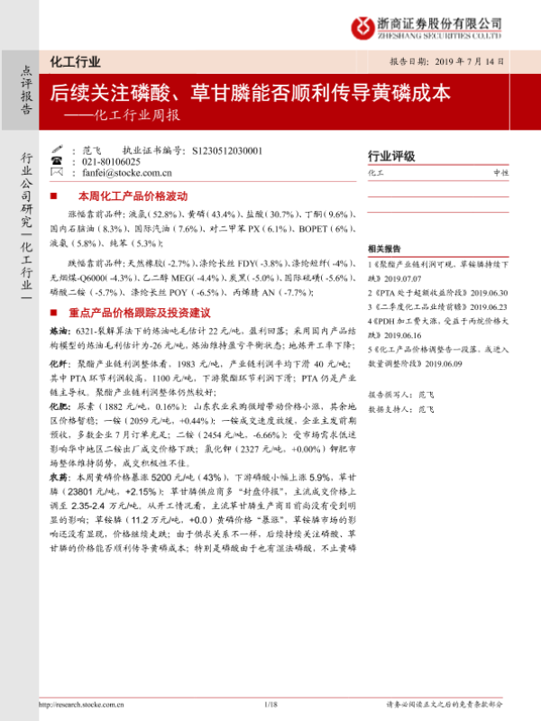 【浙商证券】【20190714】20190714-浙商证券-化工行业周报:后续关注磷酸、草甘膦能否顺利传导黄磷成本-18页