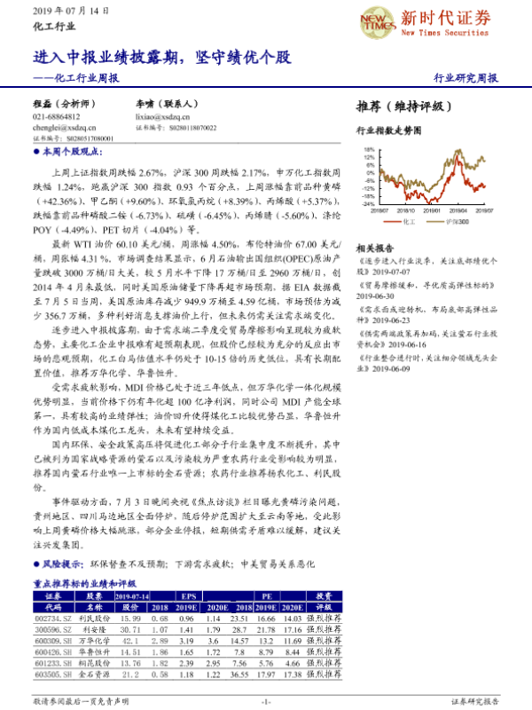 【新时代证券】【20190714】20190714-新时代证券-化工行业周报:进入中报业绩披露期,坚守绩优个股-27页