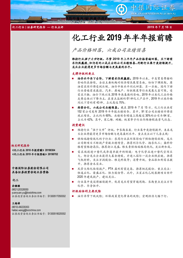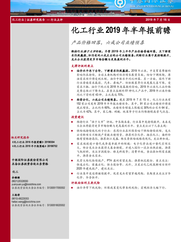 【中银证券】【20190716】化工行业2019年半年报前瞻:产品价格回落,六成公司业绩预喜-10页