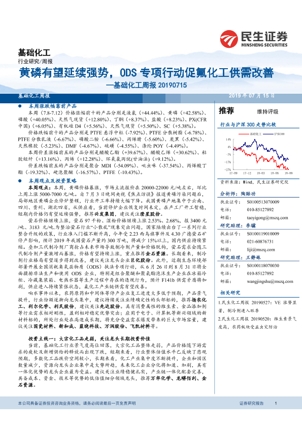 【民生证券】【20190715】20190715-民生证券-基础化工周报:黄磷有望延续强势,ODS专项行动促氟化工供需改善-30页
