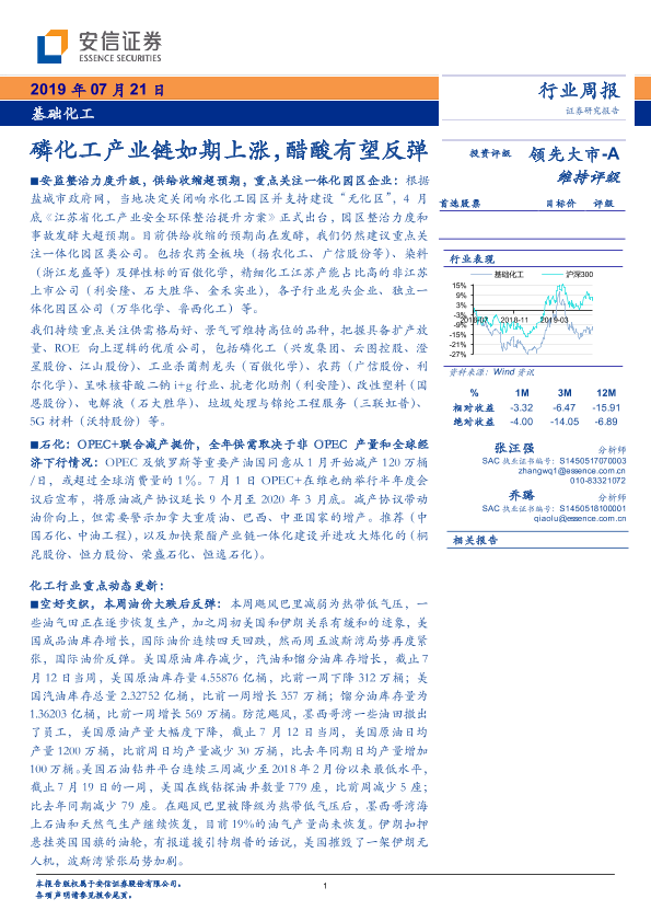【安信证券】【20190721】基础化工行业周报:磷化工产业链如期上涨,醋酸有望反弹-11页
