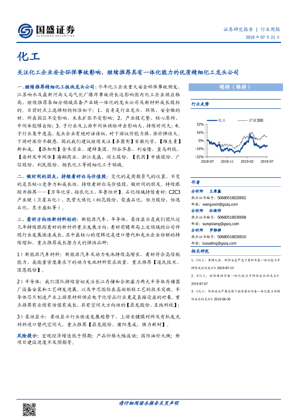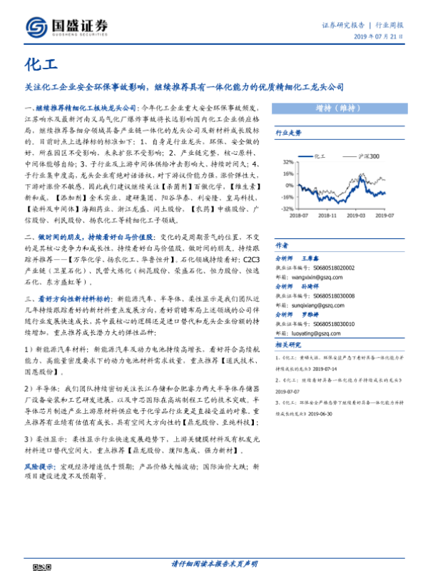 【国盛证券】【20190721】化工行业周报:关注化工企业安全环保事故影响,继续推荐具有一体化能力的优质精细化工龙头公司-8页