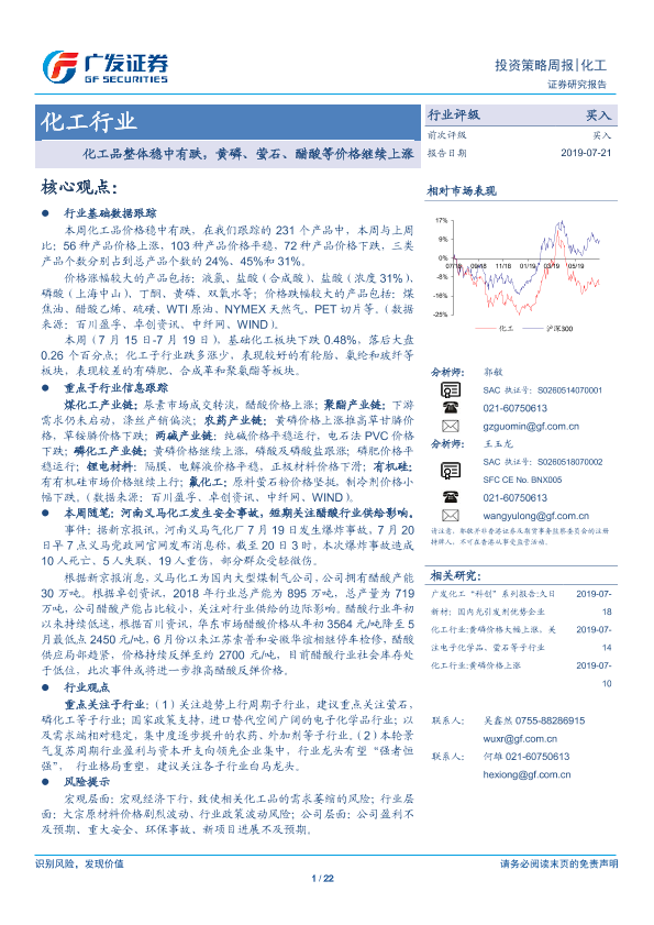 【广发证券】【20190721】20190721-广发证券-化工行业投资策略周报:化工品整体稳中有跌,黄磷、萤石、醋酸等价格继续上涨-22页