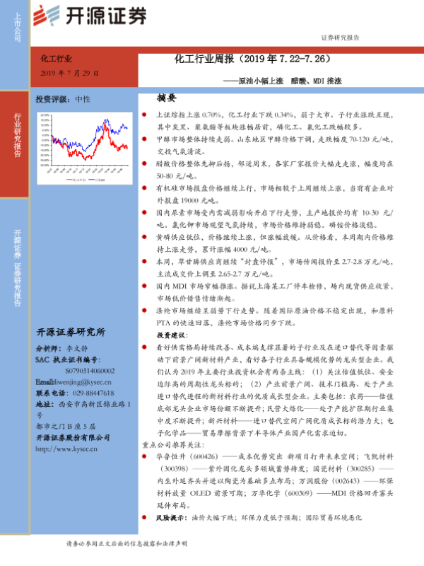 【开源证券】【20190729】20190729-开源证券-化工行业周报:原油小幅上涨 醋酸、MDI推涨-18页