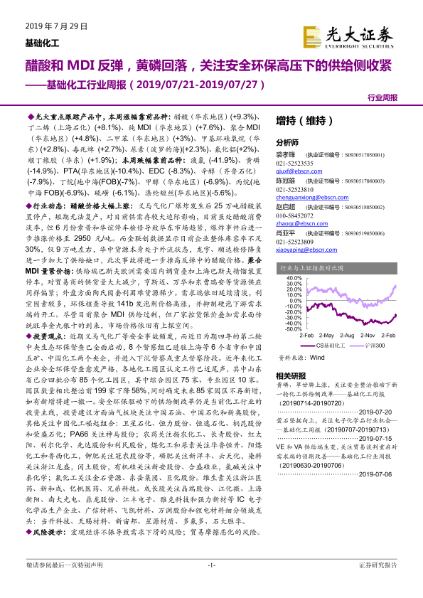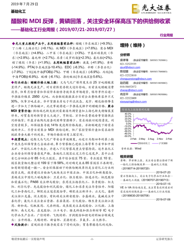 【光大证券】【20190729】基础化工行业周报:醋酸和MDI反弹,黄磷回落,关注安全环保高压下的供给侧收紧-19页