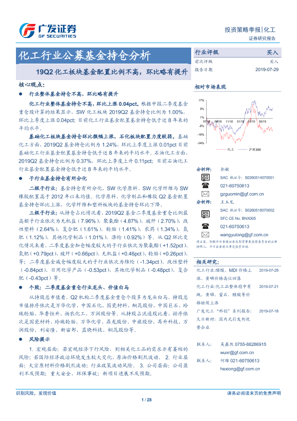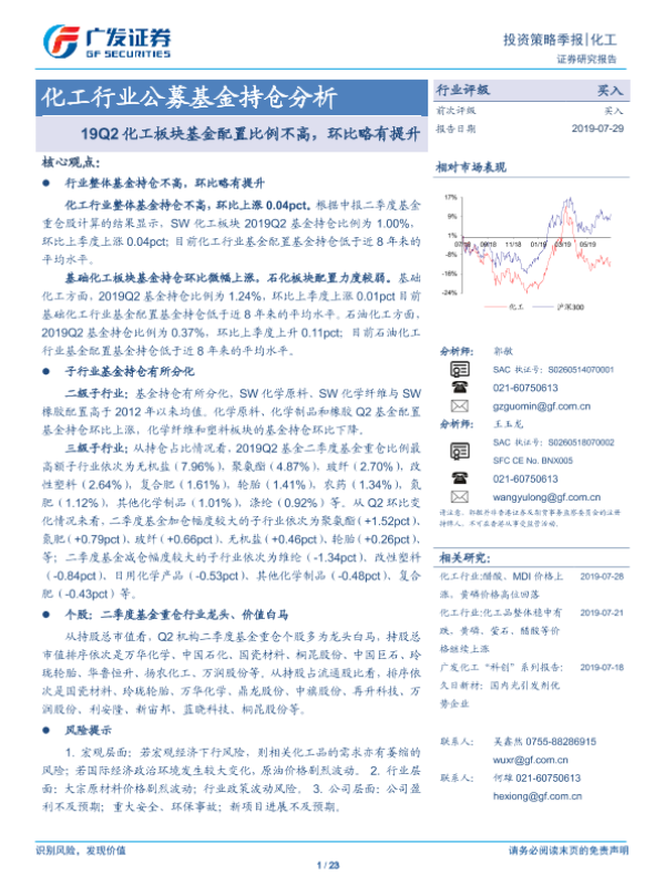 【广发证券】【20190729】20190729-广发证券-化工行业公募基金持仓分析:19Q2化工板块基金配置比例不高,环比略有提升-23页