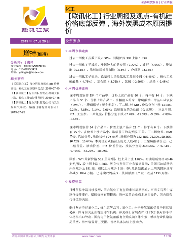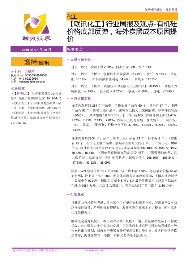 【粤开证券】【20190729】行业周报及观点-有机硅价格底部反弹,海外炭黑成本原因提价-30页
