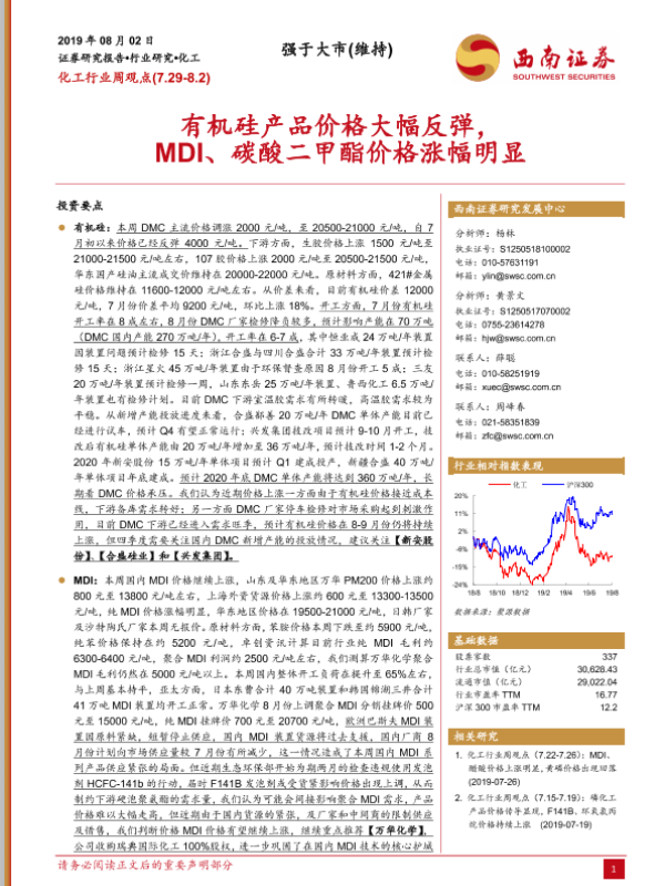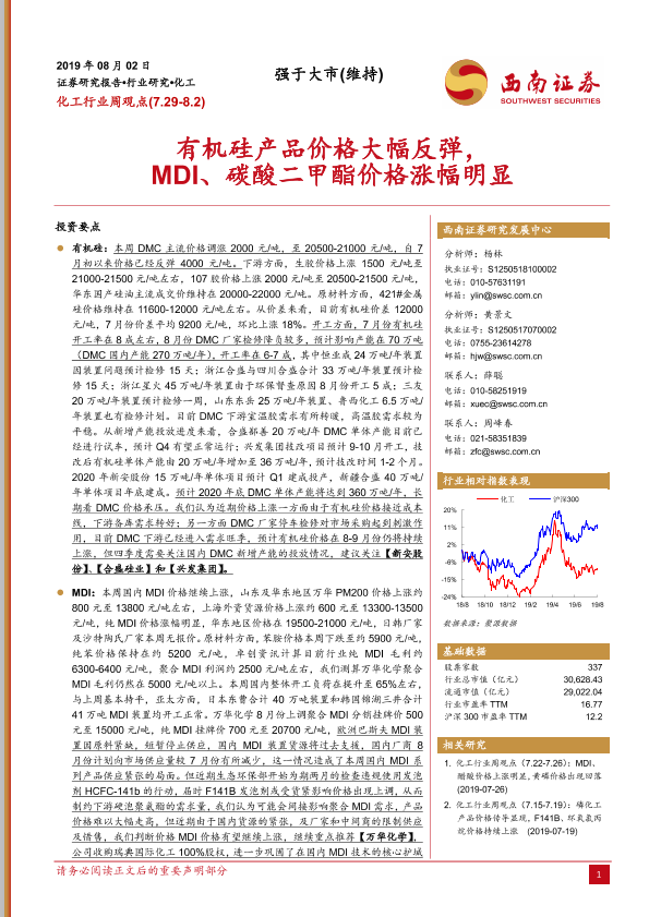 【西南证券】【20190802】化工行业周观点:有机硅产品价格大幅反弹,MDI、碳酸二甲酯价格涨幅明显-5页