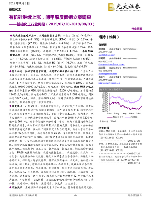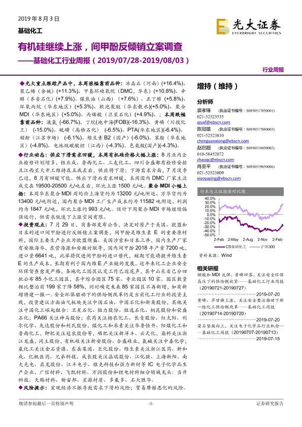 【光大证券】【20190803】基础化工行业周报:有机硅继续上涨,间甲酚反倾销立案调查-19页