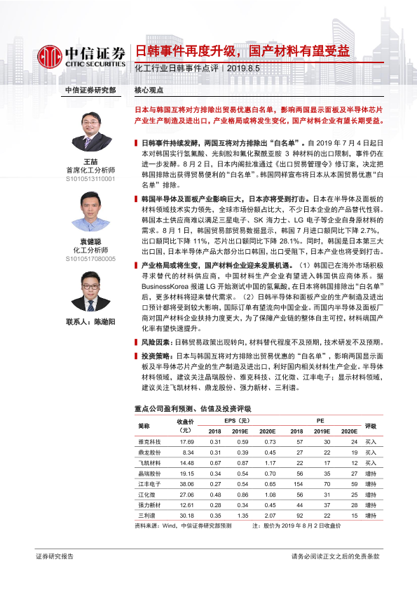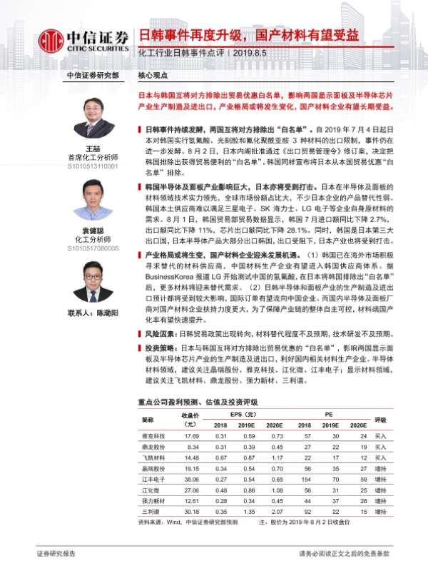 【中信证券】【20190805】化工行业日韩事件点评:日韩事件再度升级,国产材料有望受益-2页