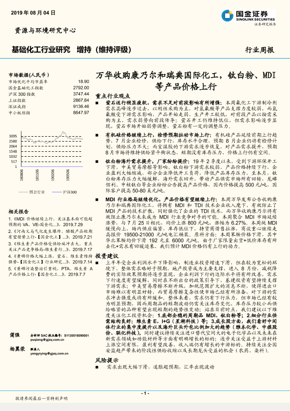 【国金证券】【20190804】基础化工行业研究周报:万华收购康乃尔和瑞典国际化工,钛白粉、MDI等产品价格上行-32页