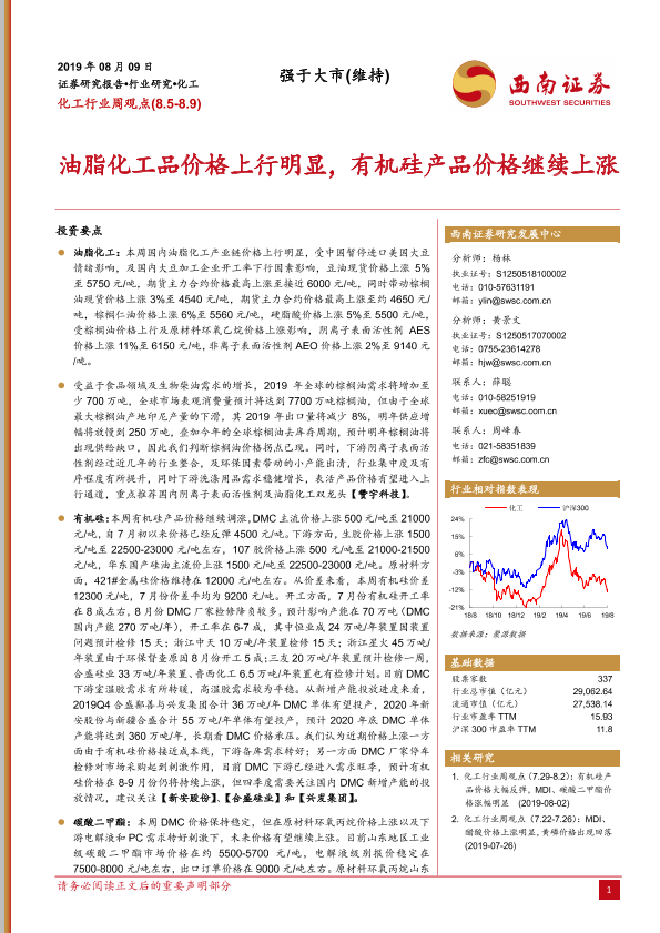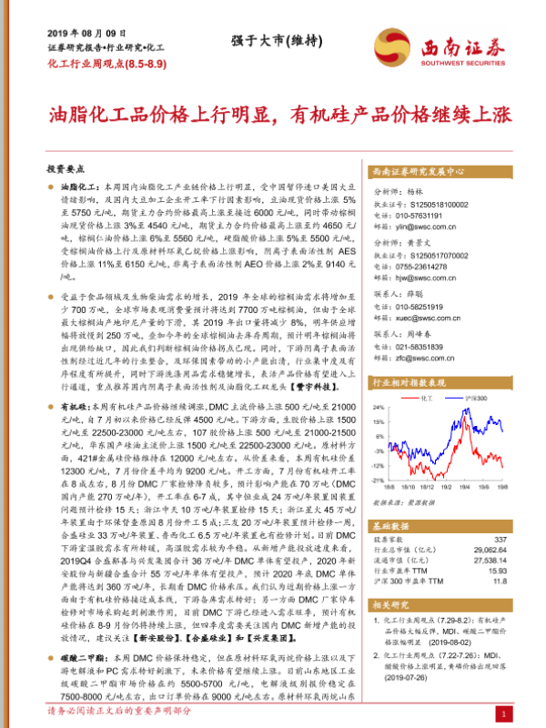 【西南证券】【20190809】化工行业周观点:油脂化工品价格上行明显,有机硅产品价格继续上涨-5页