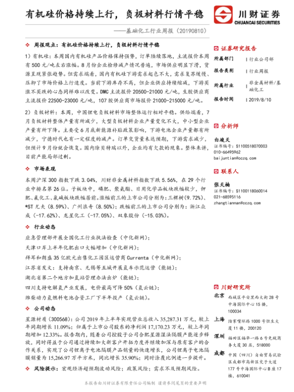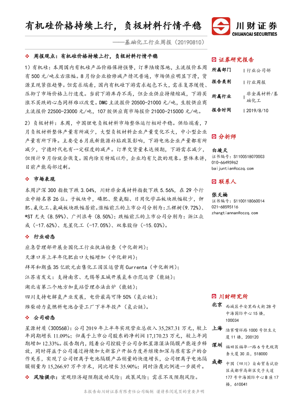 【川财证券】【20190810】基础化工行业周报:有机硅价格持续上行,负极材料行情平稳-21页
