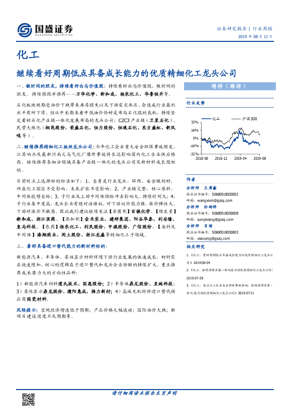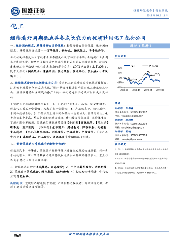 【国盛证券】【20190811】化工行业周报:继续看好周期低点具备成长能力的优质精细化工龙头公司-8页