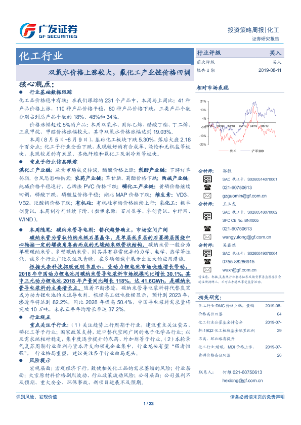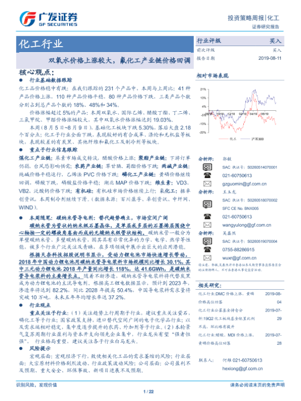 【广发证券】【20190811】20190811-广发证券-化工行业投资策略周报:双氧水价格上涨较大,氟化工产业链价格回调-22页