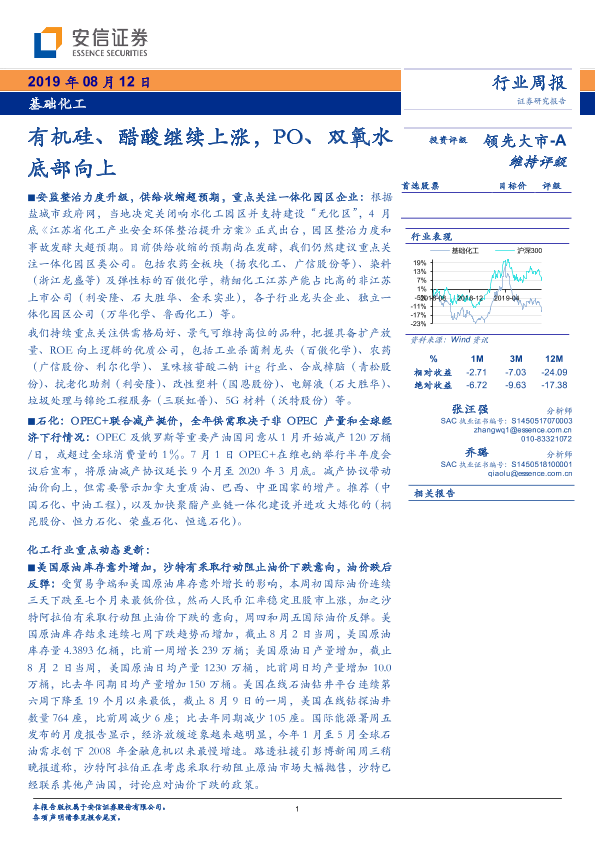 【安信证券】【20190812】基础化工行业周报:有机硅、醋酸继续上涨,PO、双氧水底部向上-11页