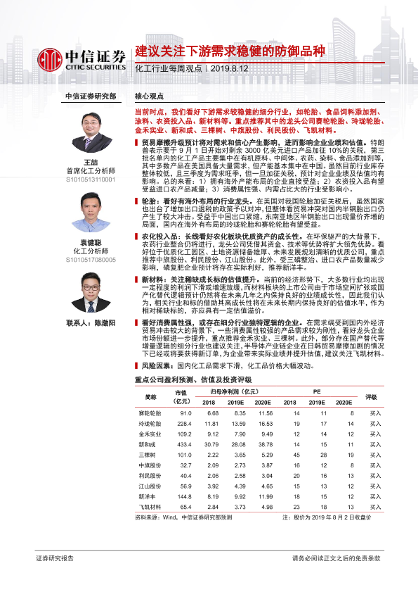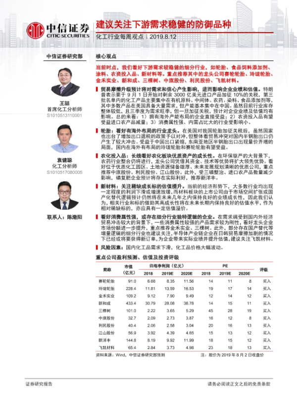 【中信证券】【20190812】20190812-中信证券-化工行业每周观点:建议关注下游需求稳健的防御品种-26页