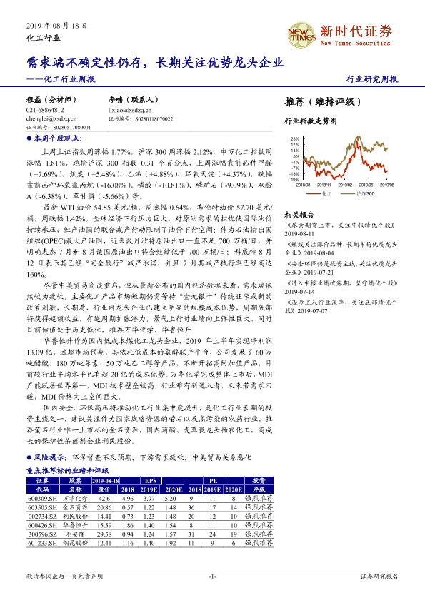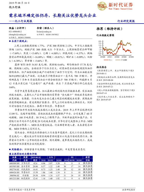 【新时代证券】【20190818】20190818-新时代证券-化工行业周报:需求端不确定性仍存,长期关注优势龙头企业-30页