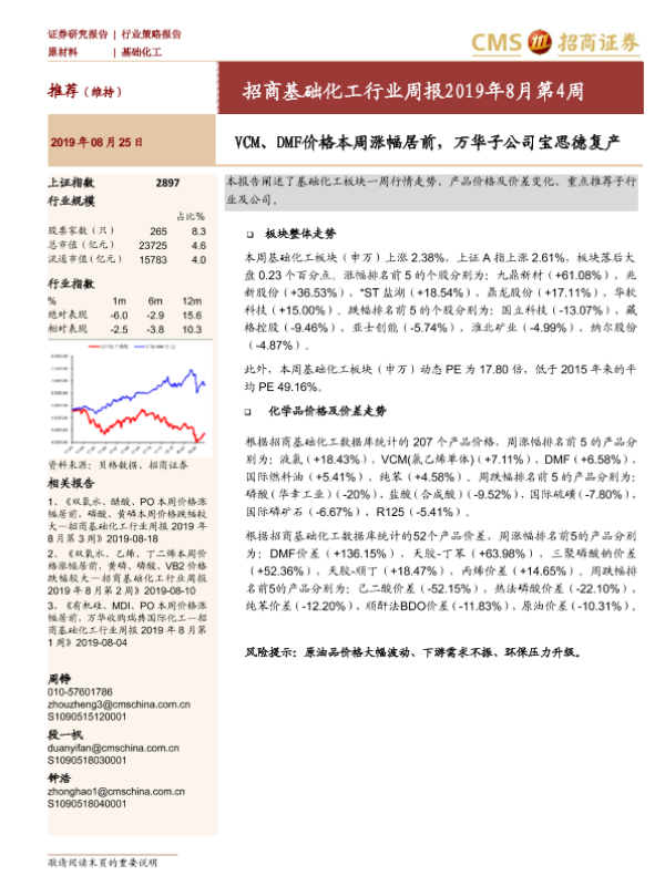【海通证券】【20190825】招商基础化工行业周报2019年8月第4周:VCM、DMF价格本周涨幅居前,万华子公司宝思德复产-18页