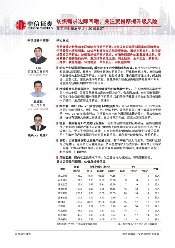 【中信证券】【20190827】20190827-中信证券-化工行业每周观点:纺织需求边际回暖,关注贸易摩擦升级风险-29页