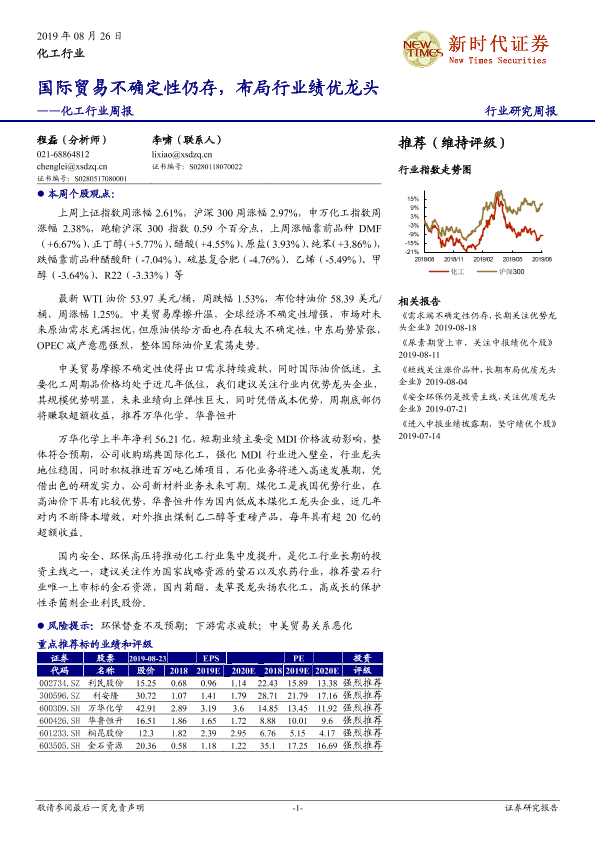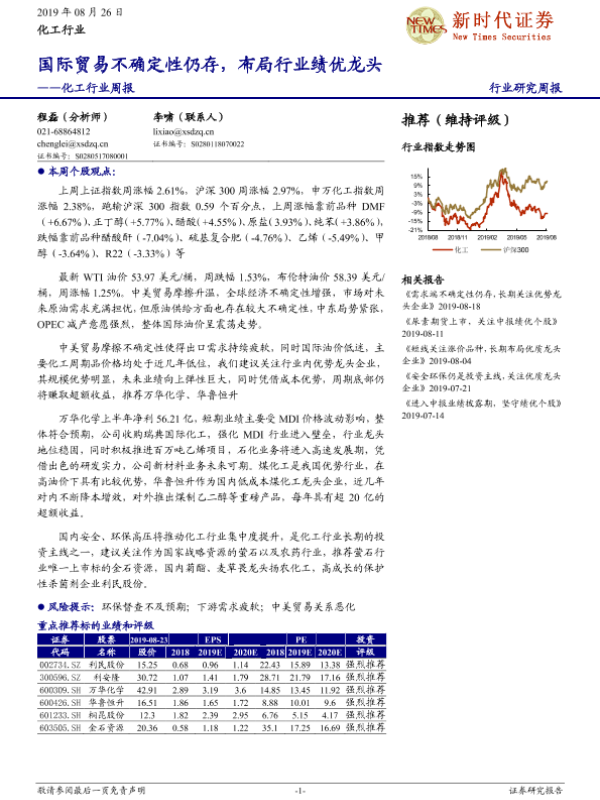 【新时代证券】【20190826】20190826-新时代证券-化工行业周报:国际贸易不确定性仍存,布局行业绩优龙头-28页