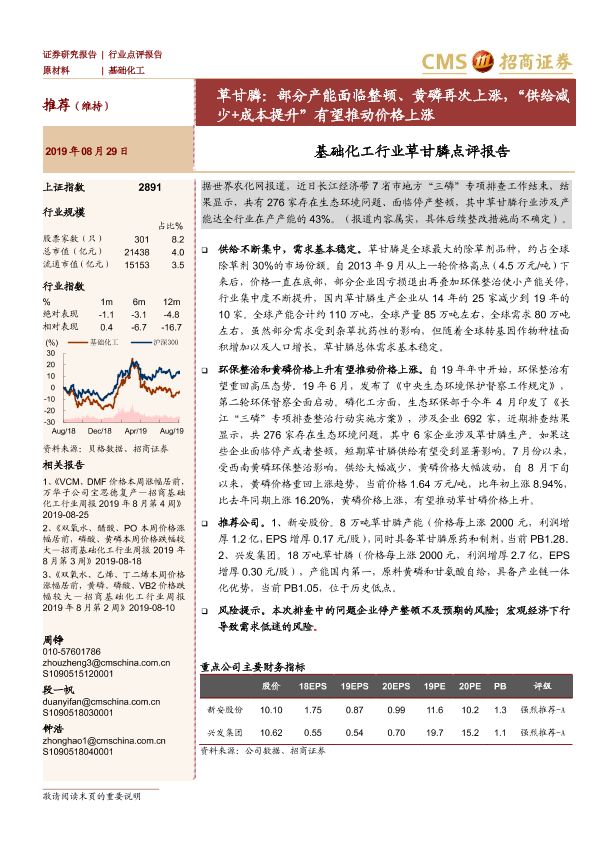 【海通证券】【20190829】基础化工行业草甘膦点评报告:草甘膦:部分产能面临整顿、黄磷再次上涨,“供给减少+成本提升”有望推动价格上涨-2页