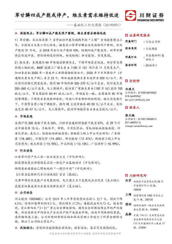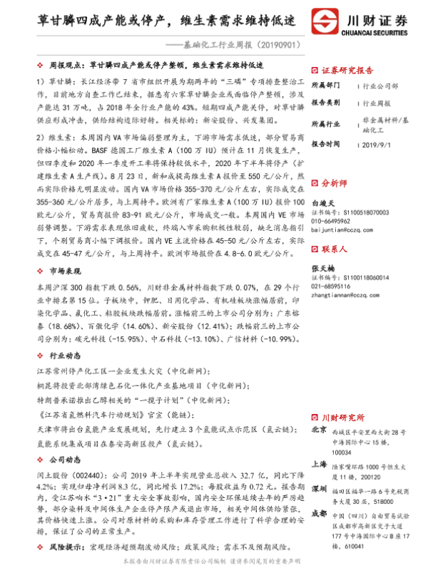 【川财证券】【20190901】基础化工行业周报:草甘膦四成产能或停产,维生素需求维持低迷-22页