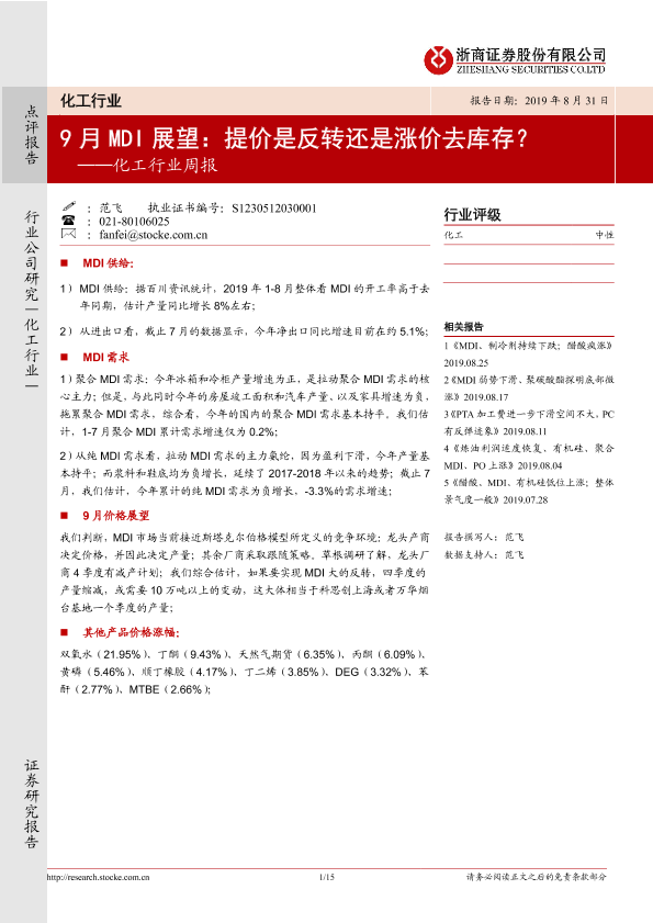 【浙商证券】【20190831】20190831-浙商证券-化工行业周报:9月MDI展望:提价是反转还是涨价去库存?-15页