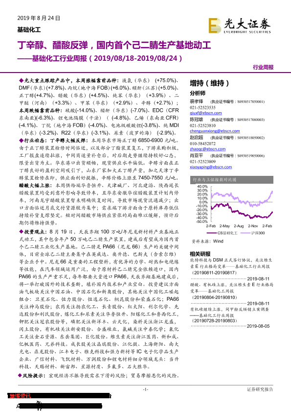 【光大证券】【20190824】20190824-光大证券-基础化工行业周报:丁辛醇、醋酸反弹,国内首个己二腈生产基地动工-19页