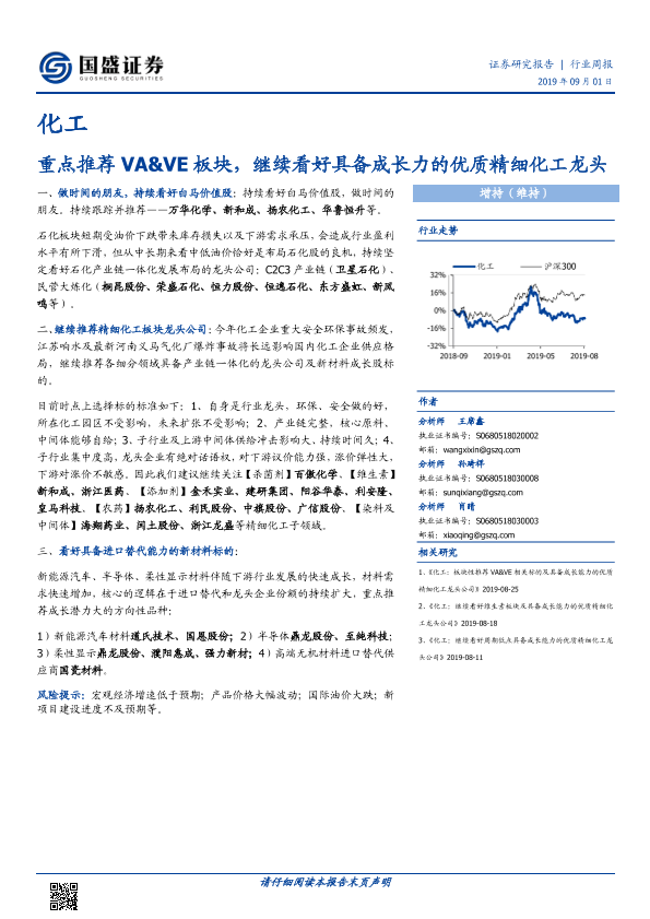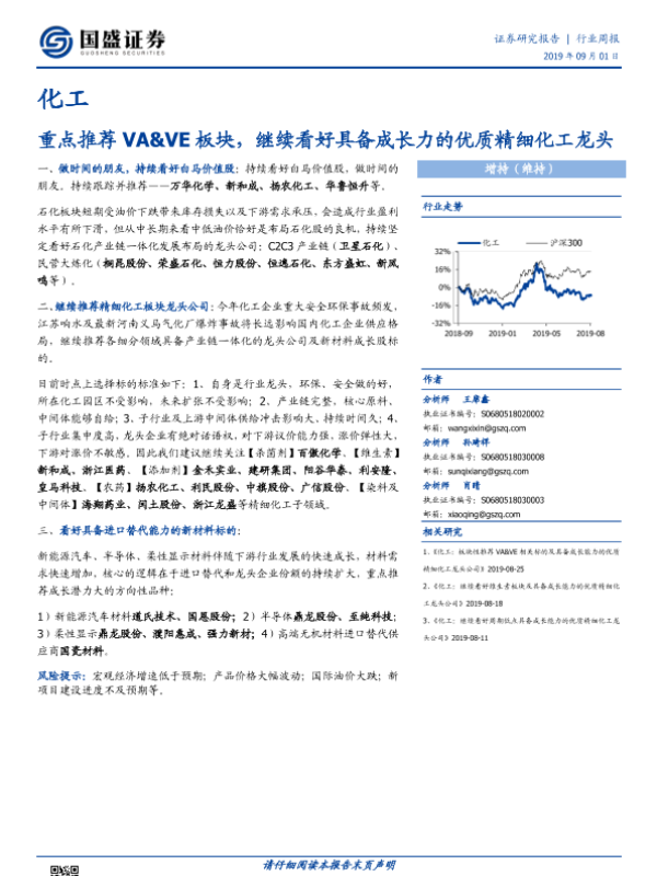 【国盛证券】【20190901】20190901-国盛证券-化工行业周报:重点推荐VA&VE板块,继续看好具备成长力的优质精细化工龙头-9页
