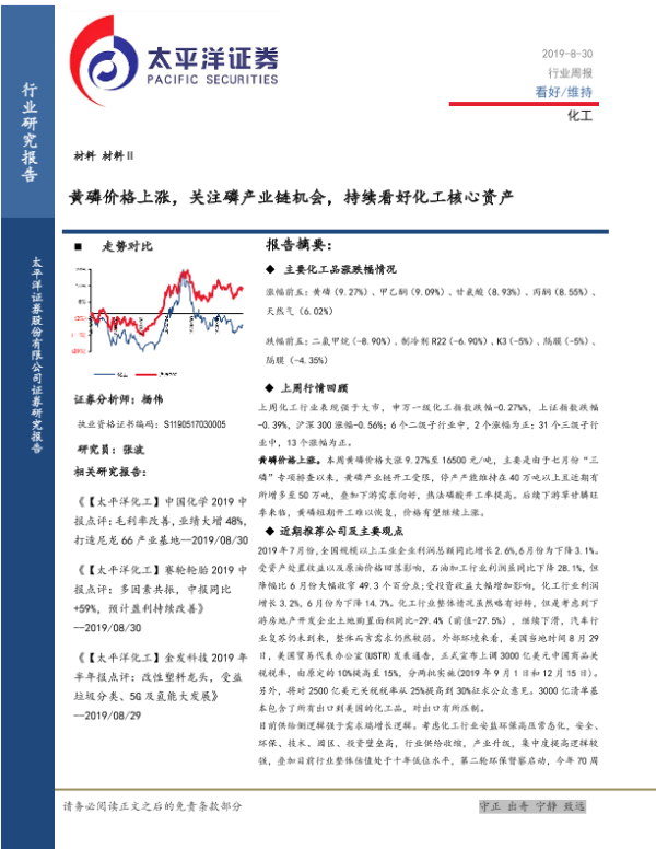 【太平洋证券】【20190830】20190830-太平洋-化工行业周报:黄磷价格上涨,关注磷产业链机会,持续看好化工核心资产-38页