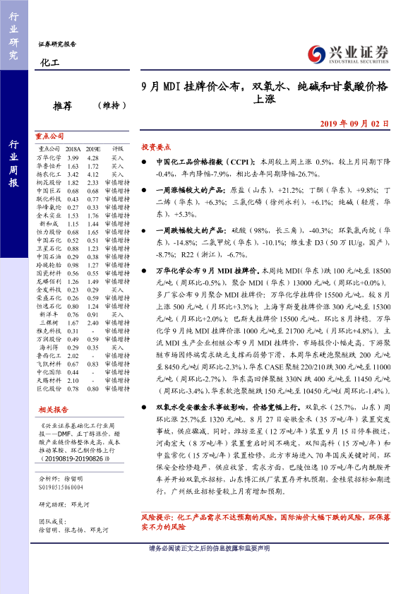 【兴业证券】【20190902】20190902-兴业证券-化工行业周报:9月MDI挂牌价公布,双氧水、纯碱和甘氨酸价格上涨-34页