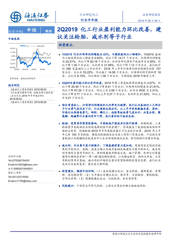 【海通证券】【20190906】2Q2019化工行业盈利能力环比改善,建议关注轮胎、减水剂等子行业-18页