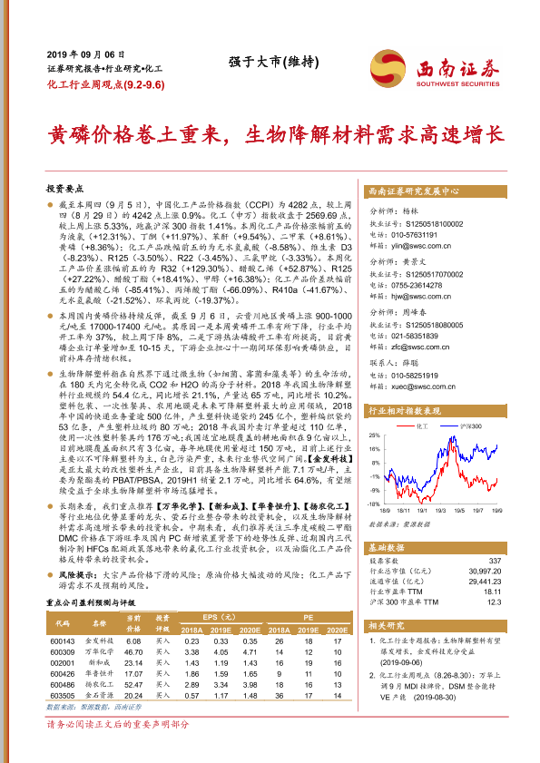 【西南证券】【20190906】20190906-西南证券-化工行业周观点:黄磷价格卷土重来,生物降解材料需求高速增长-8页