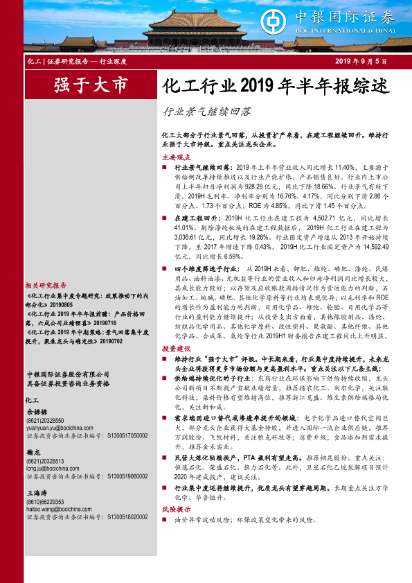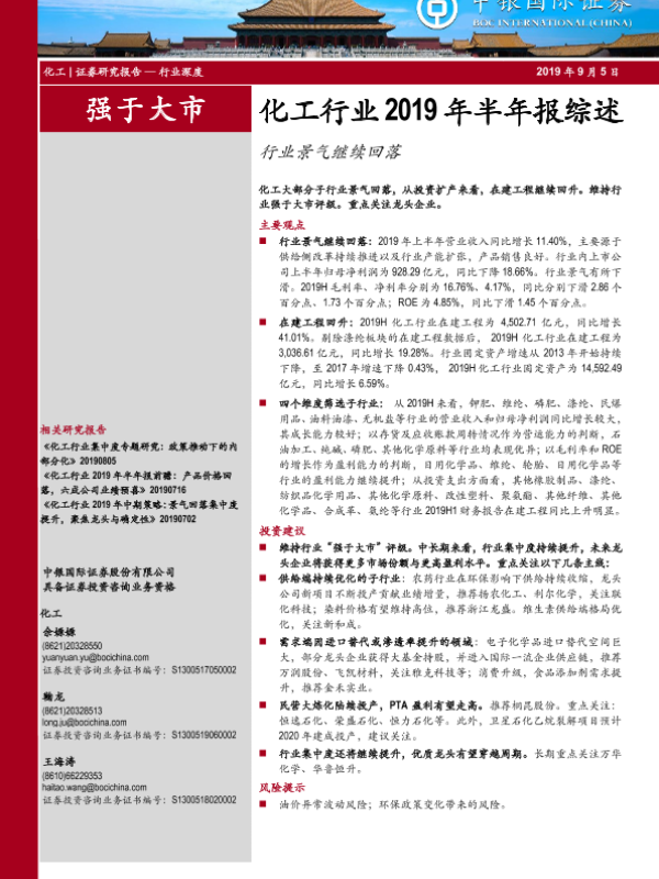 【中银证券】【20190905】化工行业2019年半年报综述:行业景气继续回落-24页