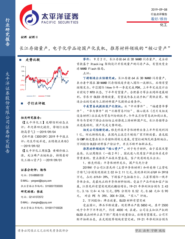 【太平洋证券】【20190908】化工行业点评报告:长江存储量产,电子化学品迎国产化良机,推荐材料领域的“核心资产”-4页