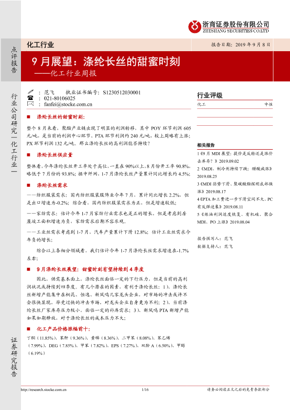 【浙商证券】【20190908】20190908-浙商证券-化工行业周报:9月展望:涤纶长丝的甜蜜时刻-16页
