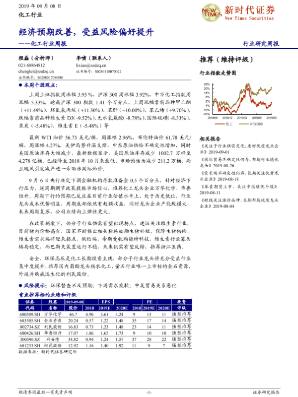 【新时代证券】【20190908】20190908-新时代证券-化工行业周报:经济预期改善,受益风险偏好提升-29页