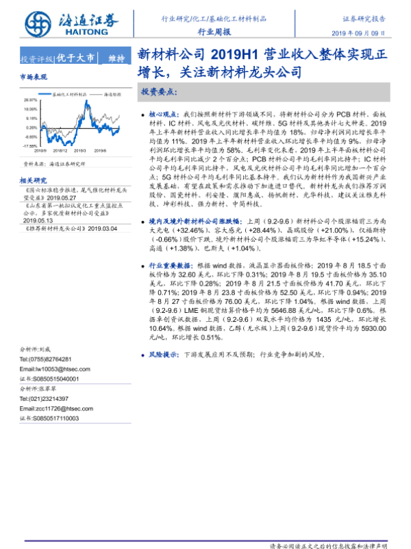 【海通证券】【20190909】基础化工材料制品行业周报:新材料公司2019H1营业收入整体实现正增长,关注新材料龙头公司-13页