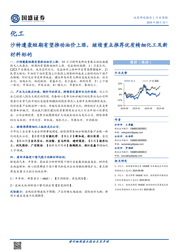 【国盛证券】【20190915】20190915-国盛证券-化工行业周报:沙特遭袭短期有望推动油价上涨,继续重点推荐优质精细化工及新材料标的-9页