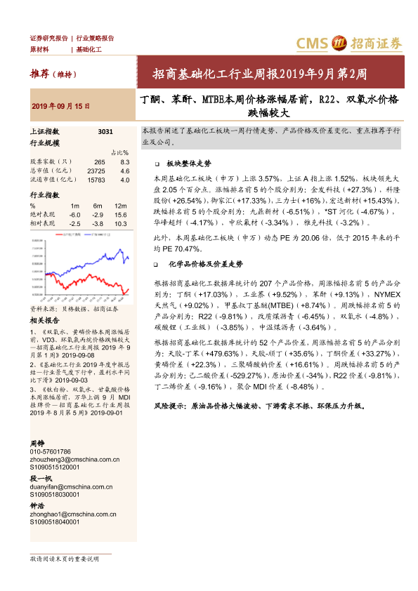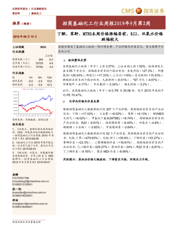丁酮 化学品价格 双氧水 基础化工 行业周报