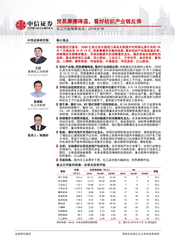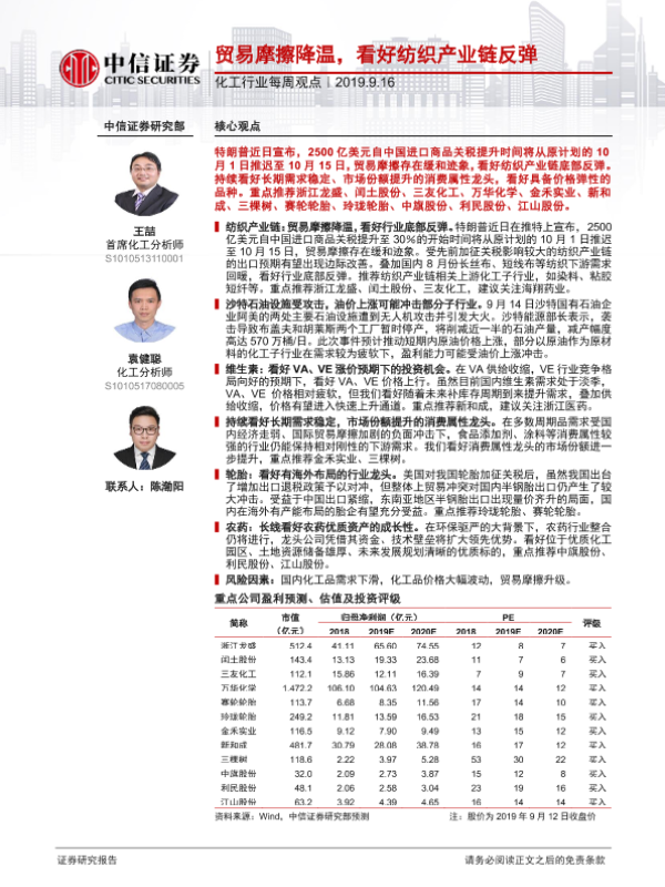 【中信证券】【20190916】20190916-中信证券-化工行业每周观点:贸易摩擦降温,看好纺织产业链反弹-26页