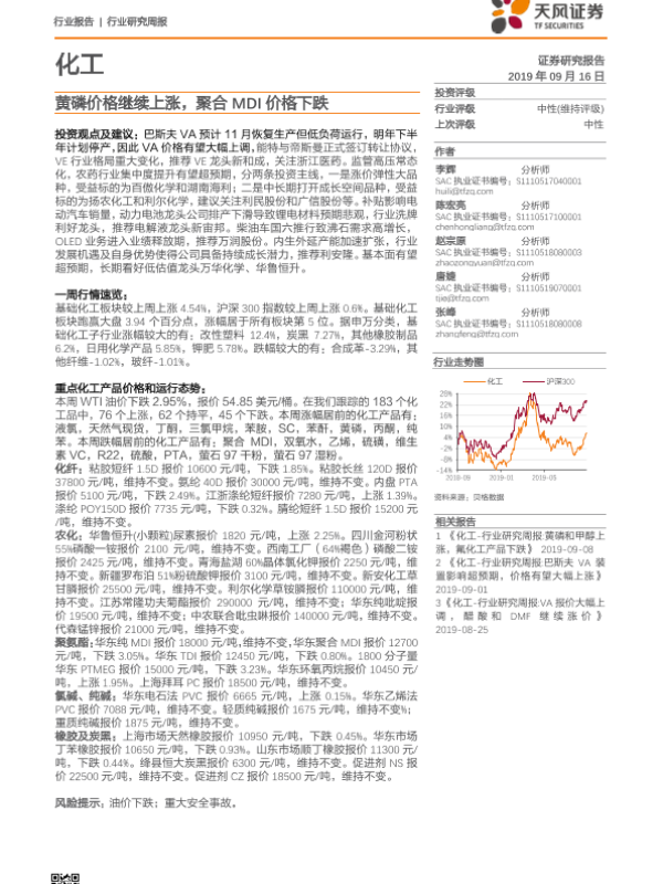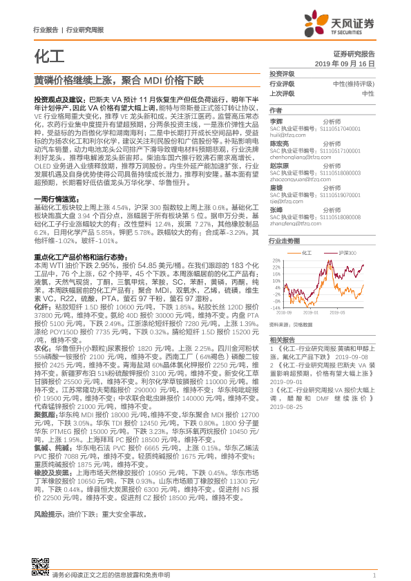 【天风证券】【20190916】20190916-天风证券-化工行业研究周报:黄磷价格继续上涨,聚合MDI价格下跌-18页